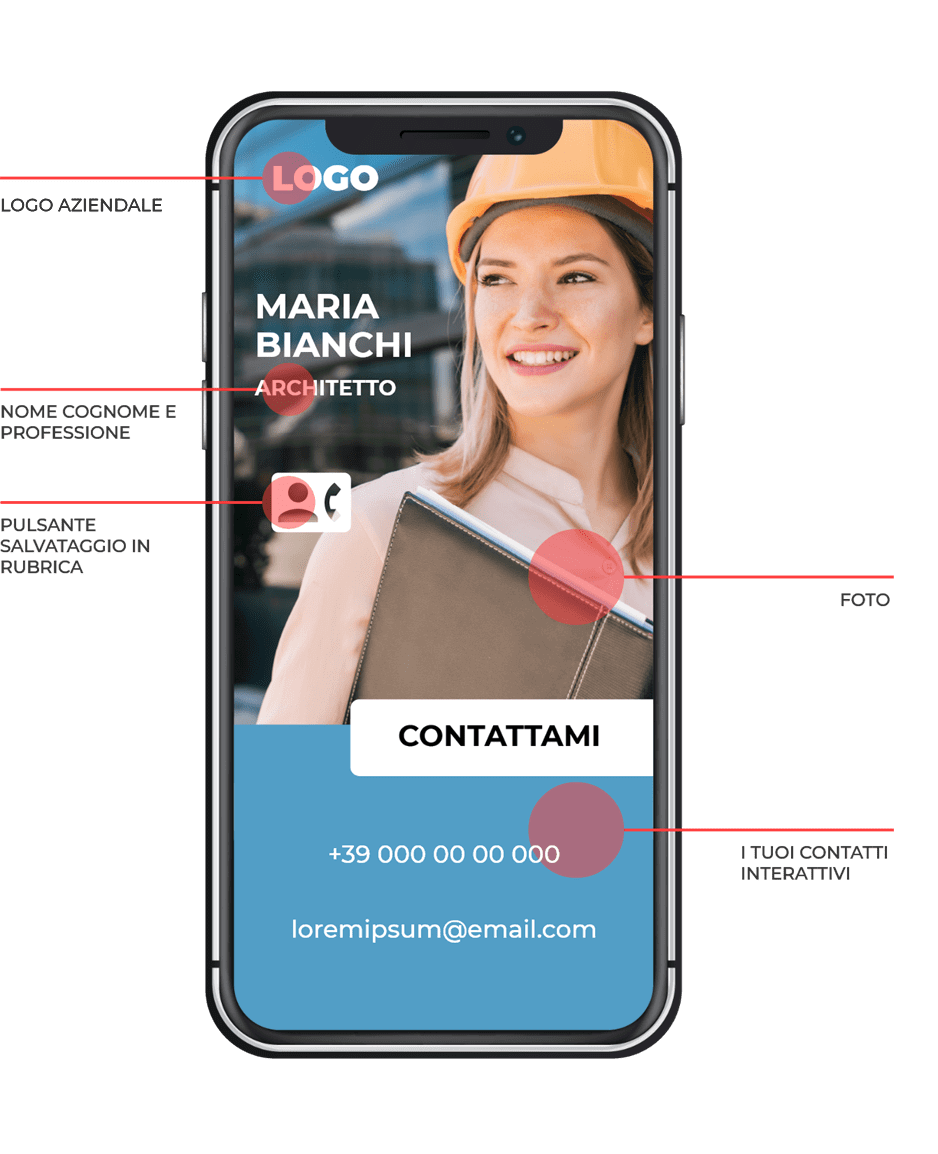 Personalizza il contenuto del tuo biglietto da visita digitale e sfrutta la potenzialità dei pulsanti ad azione rapida per farti contattare con facilità.